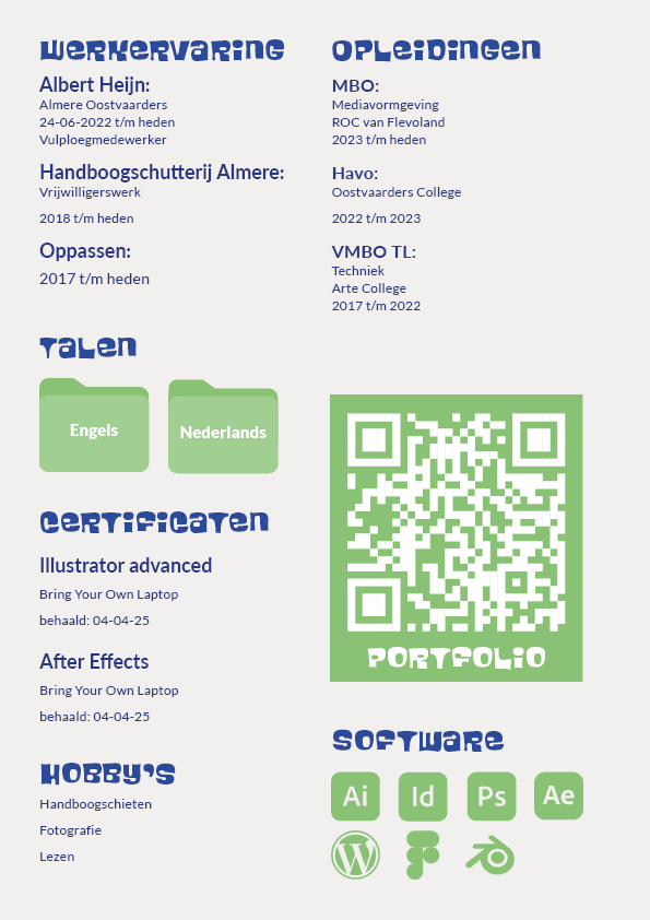 Mijn favoriete tools zijn InDesign en Blender, waar ik met veel plezier en een scherp oog voor detail werk. Het creëren van visuele concepten die zowel esthetisch als functioneel zijn, vind ik ontzettend interessant. Of het nu gaat om digitale ontwerpen, printmateriaal of 3D-modellen, ik ben altijd enthousiast om nieuwe uitdagingen aan te gaan en mijn vaardigheden verder te ontwikkelen.